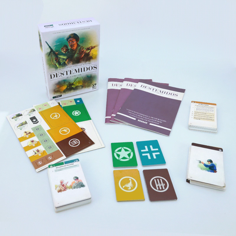Destemidos – Reforços é uma expansão modular que introduz uma série de novas regras, cenários e unidades. Libere os poderosos tanques alemães e estadunidenses e descubra novas opções táticas para o seu esquadrão em Destemidos – Normandia, ou use minas terrestres, aviões de assalto e outras unidades para superar seu inimigo em Destemidos – Norte da África. Quer tenha um jogo ou outro da série Destemidos, com Reforços você poderá jogar pela primeira vez um modo para quatro jogadores ou testar um desafiador modo solo criado por Dávid Turczi e David Digby.