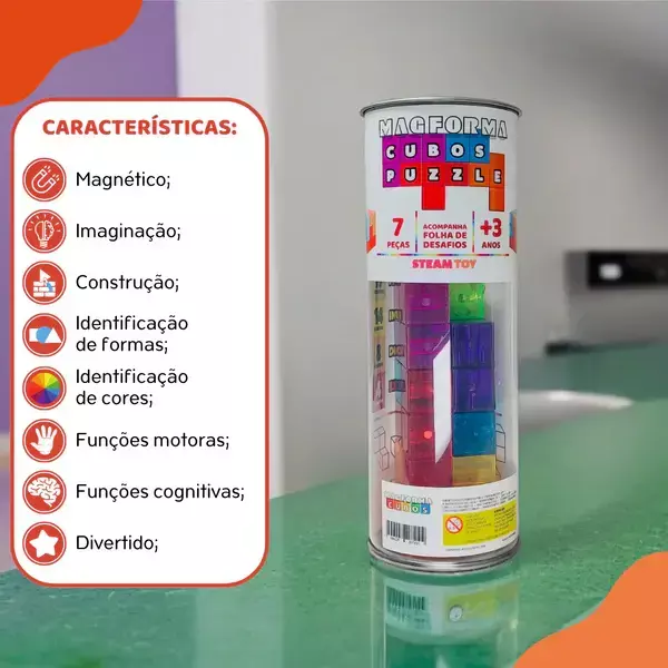 MagForma Cubos Puzzle Translúcido é um conjunto criativo e sensorial que estimula o raciocínio lógico, a coordenação motora e a percepção visual das crianças. Com cubos translúcidos magnéticos que se conectam em diferentes ângulos, este puzzle convida os pequenos a explorar combinações e formas de maneira livre e divertida. Ideal para brincadeiras educativas e interativas, é perfeito para desenvolver a concentração e a criatividade desde cedo.