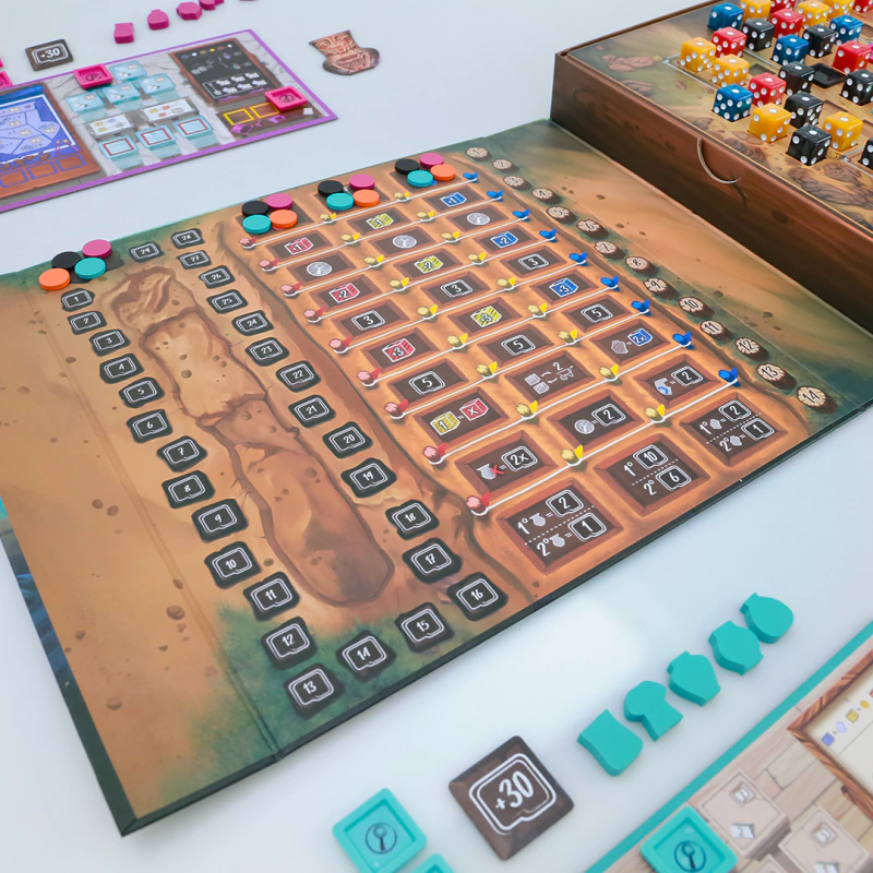 Use dados coloridos em um tabuleiro inspirado no clássico “Resta Um”, usando algumas de suas mecânicas básicas, misturadas com manipulação de dados, avanço de trilhas e bônus final de jogo.