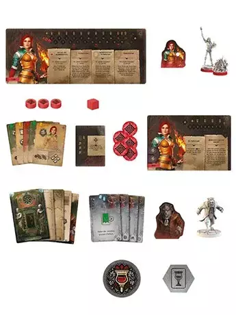 This expansion adds new components: the Triss miniature and standee, Nivellen miniature and standee, a solo Automa tableau, a double-layered character tableau, new story cards, mystery cards, markers, and more. These new elements integrate with the base game, enriching both narrative depth and strategic options.